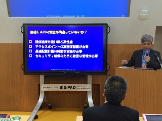 60V型液晶ディスプレイを6台使用した大型マルチスクリーンと電子黒板「BIG PAD」、タブレット端末の活用で実現する双方向のデータ連携やペーパーレス環境の導入など、模擬授業の中で最新の教育環境を実演しています。